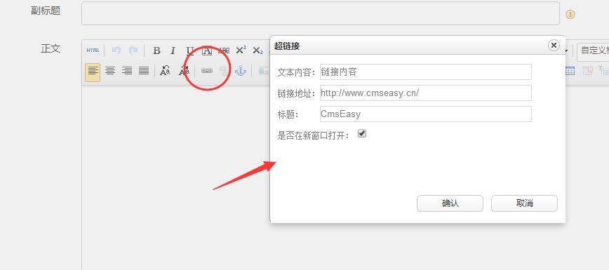 网站后台-【管理】-【内容管理】-编辑器中-点击超链接设置,