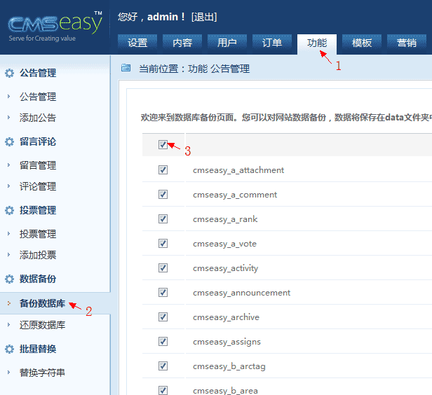 2、首先进入本机后台,点击上方菜单中的[功能],然后点打开页面左侧的[备份数据库],将所有数据库表选中,对表熟悉的朋友,也可以有选择的点选独立数据库表。