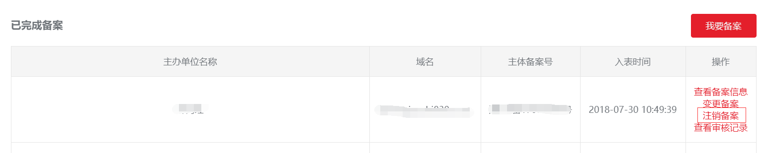 1、登录 ICP备案系统 在已完成备案里找到接入所在的主体,点击注销备案 。