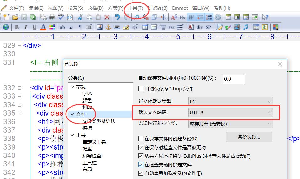 打开编辑器,在[工具]-[文件]-[编码],里面选择utf-8,选择后编辑模板保存的文件默认编码为utf-8。