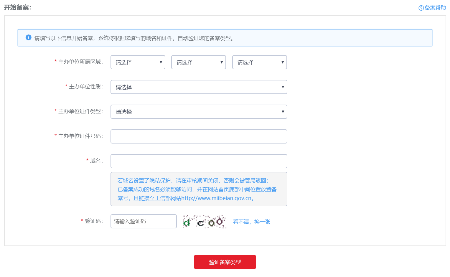 按提示填写本次备案的主体信息,填写完成点击“ 下一步,填写网站信息 ” ;(如需重新验证备案类型,可点击“ 返回,重新验证备案类型 ”)