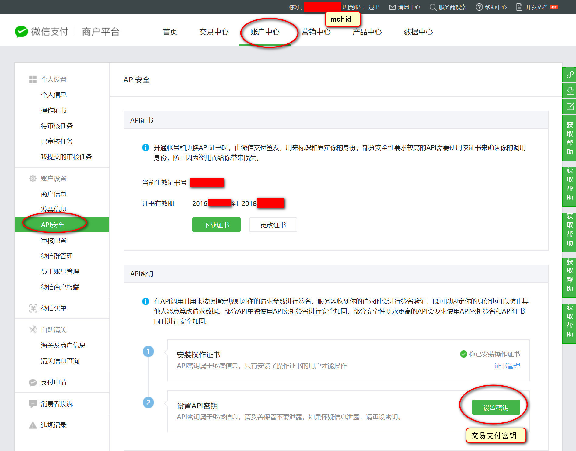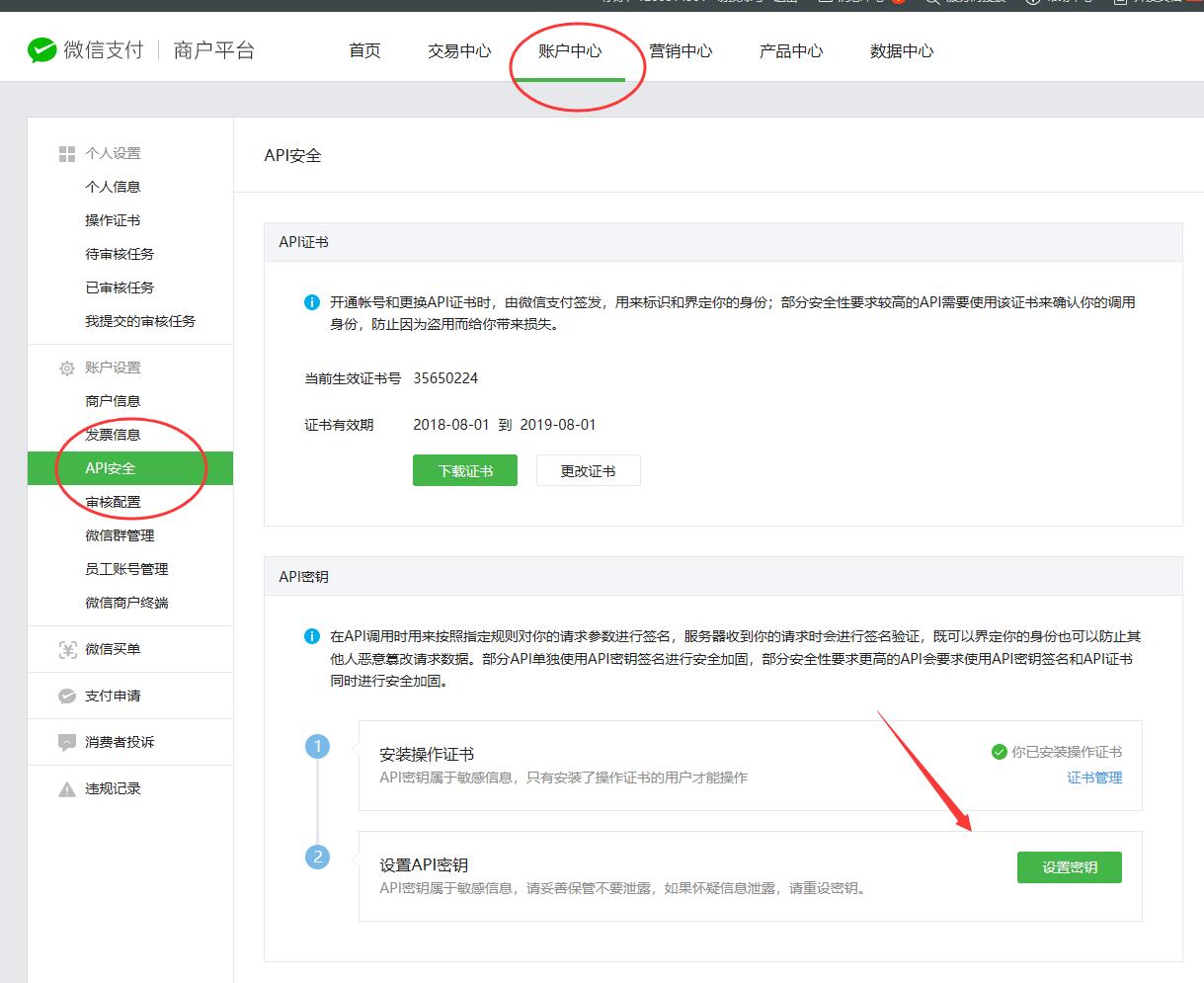 (5)KEY:登录你的微信商户平台 https://pay.weixin.qq.com/, 选择[ 账户中心 ] - [ API安全 ] - [ 设置密钥 ] 查看,如图: