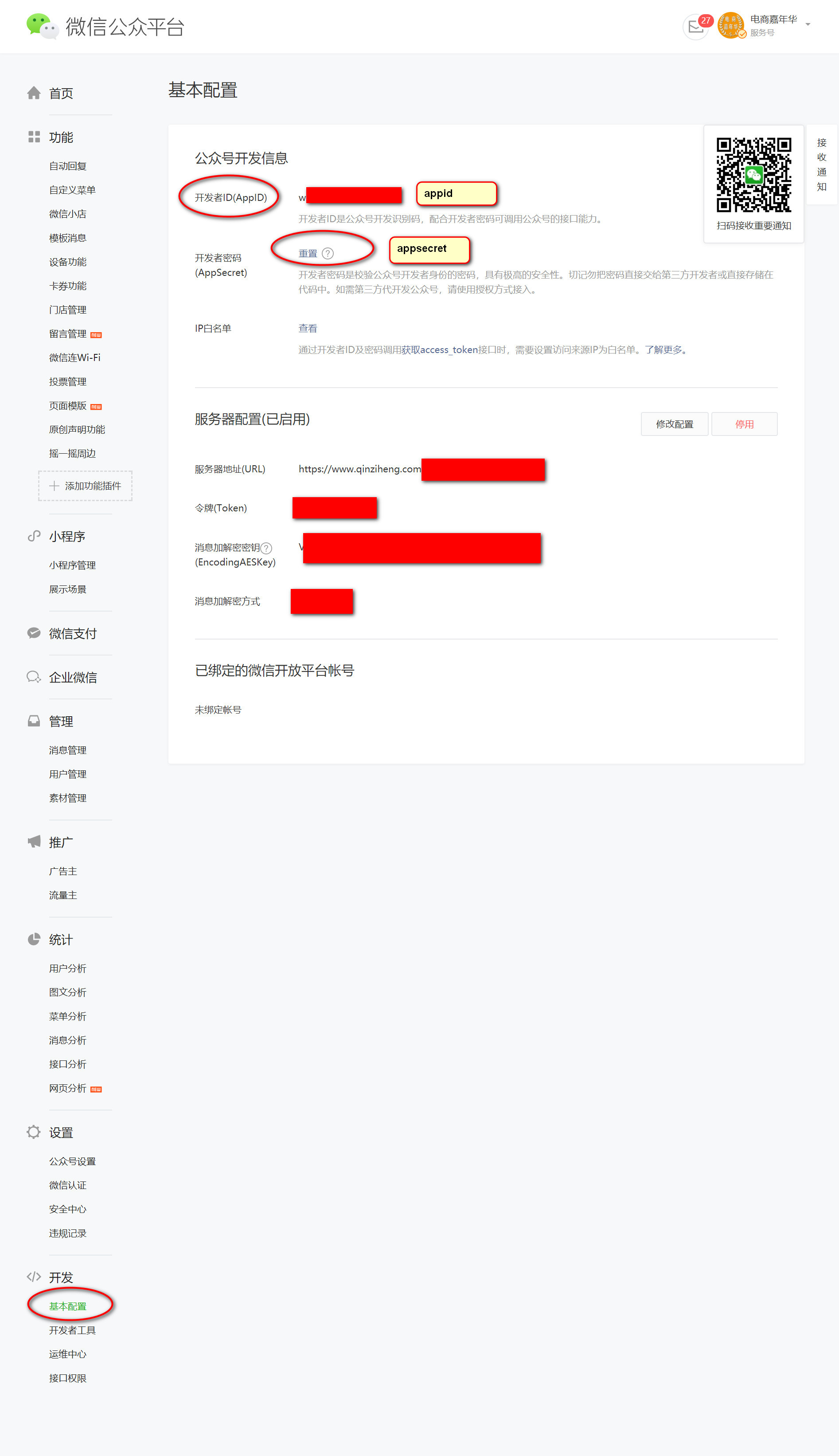 (3)APPID:登录微信公众号平台 https://mp.weixin.qq.com/,左侧找到 [ 开发 ] - 基本配置 - 在公众号开放信息中可查看到开发者ID(AppID),如图: