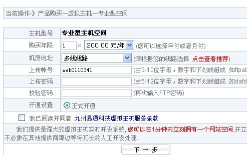 选择“产品购买”栏目,在右侧选择“虚拟主机”进入,挑选心仪的主机型号,点击”立即购买”,进入如下界面: