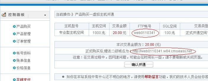 请记住FTP帐号:web0110341,及网站赠送的2级域名:http://web0110341.w84.cmseasy.net,以备后用;