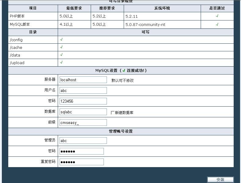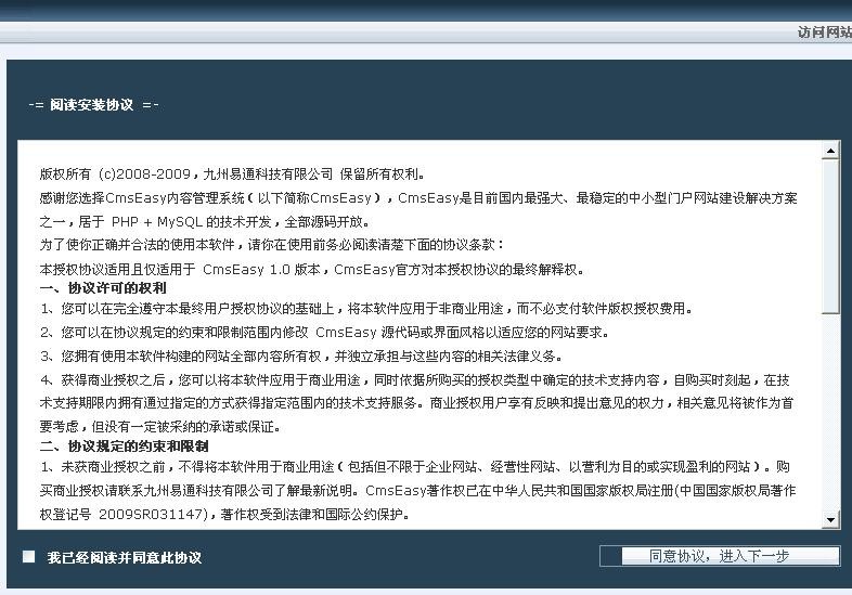 点选“易通企业网站系统是易通科技开发的中国首套免费提供模板”后,直接按“安装”按钮,开始安装。